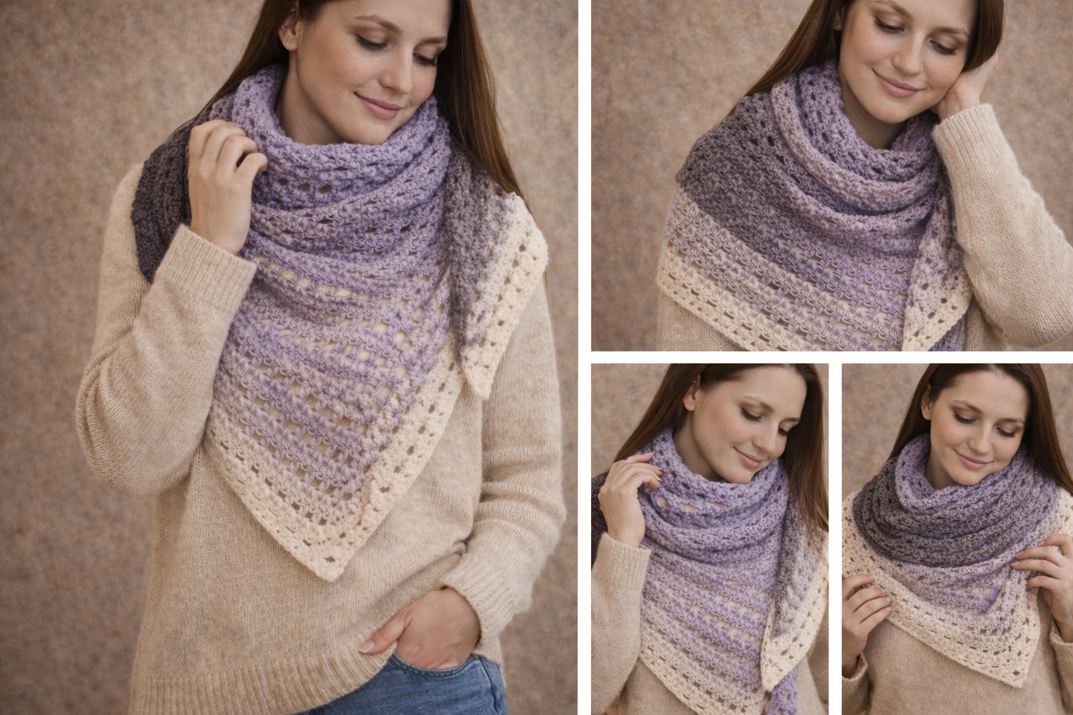 Apportez une note de douceur et d’originalité à vos tenues avec ce châle au crochet fait main, décliné dans de subtiles nuances de lilas, écru et gris. Une pièce élégante qui allie savoir-faire artisanal, confort et caractère.