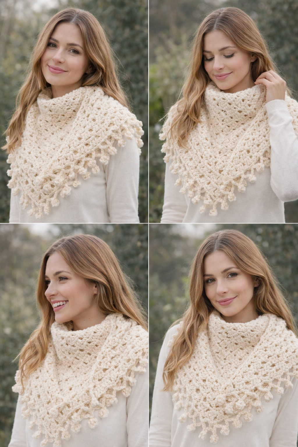 Confectionné à partir de motifs granny délicats, ce modèle séduit par son travail de mailles ajourées et sa bordure décorée de mini pompons en relief, qui lui apportent une finition originale, douce et légèrement bohème. Sa teinte blanche lumineuse en fait un accessoire intemporel, facile à associer avec toutes les garde-robes.